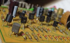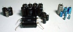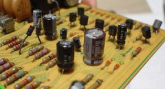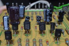 交換したコンデンサ類、左の物が電解液を噴いた形跡のあるもの