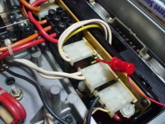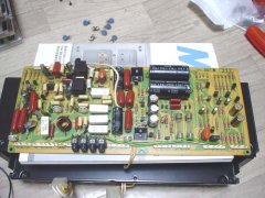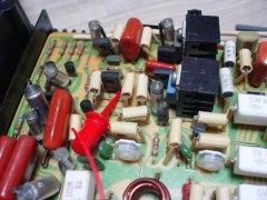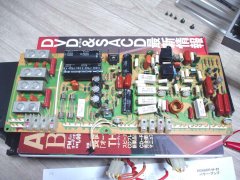 国内版へと部品を全て交換した左ch基板☆ 可変抵抗だけ新品交換した右ch基板☆ 2SC1904と2SA899Aの電圧を測る☆、正常☆ TPの電圧を測定☆、調整して正常値へ☆ これでほぼ修理完了のはず…(泣★) サージキラー基板がリレーだけで保持されている状態でちょっと怖いので 念の為、基板の真下の底板に絶縁テープを貼る☆