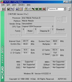 ![]() 233MHzのCPUID L2キャッシュは512KBありますし、フルスピード表示になっていますが ホントはCPUクロックの半分の動作のはずです |