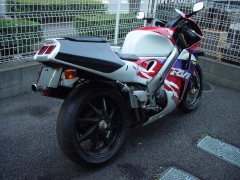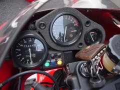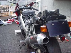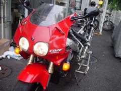 エンジンON!☆ セル一発で掛かりました☆、やった〜っ☆ ラジエターのエア抜き、エンジンオイルの量調整を行いました☆ 実はマフラーがヨシムラのスリップオンなので かなりの迫力・大音量です☆ 暖まってくると、エンジン回転数1300回転で安定しました☆ エンジンが復活したRVF☆ 残るは、足回りとブレーキのメンテです☆