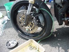 大量の水で綺麗にフリュードを洗い流して、フォークに取り付け、ブレーキパッドを組んで